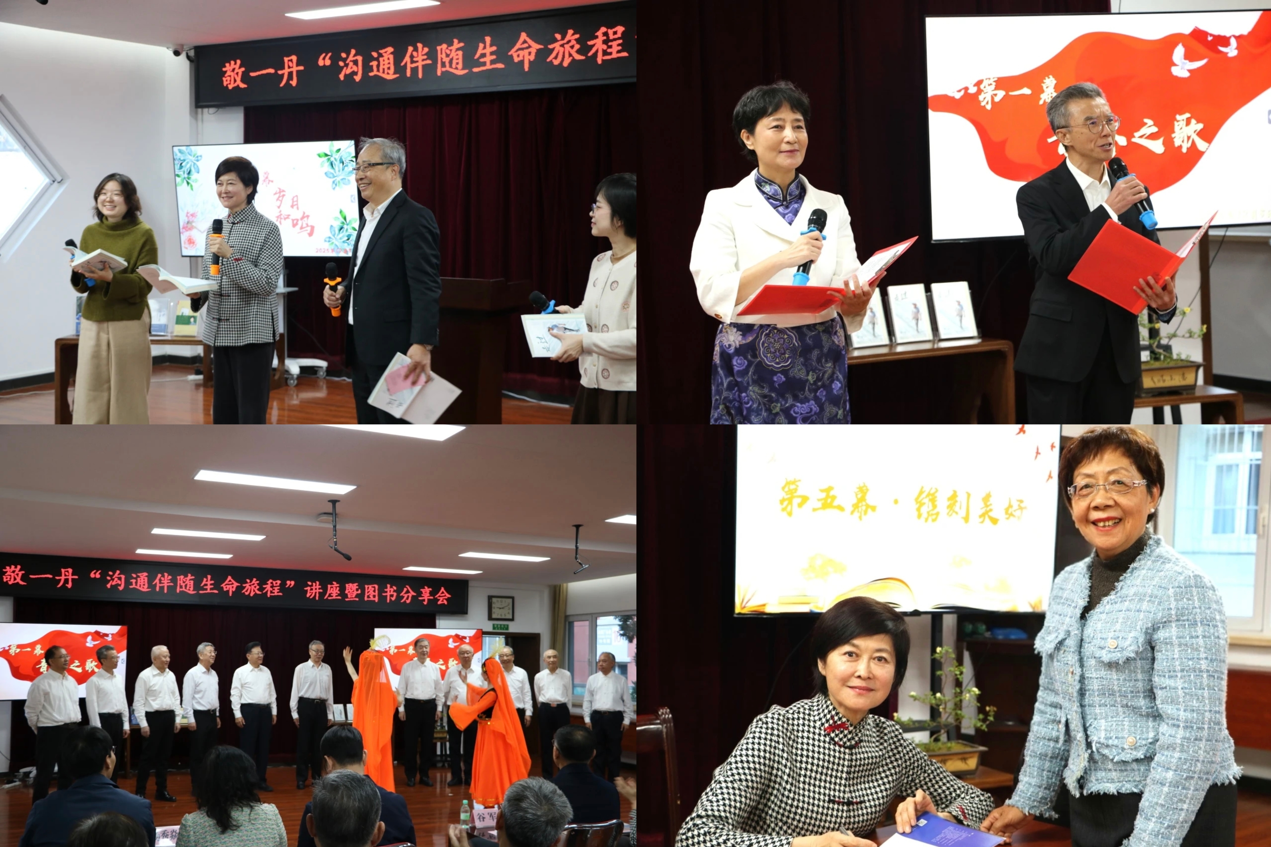 老年大学学员的歌伴舞《掀起你的盖头来》点燃全场活力,诗朗诵《青春万岁》再现往昔峥嵘岁月,微视频《云颂》传递了时光流转中的脉脉温情。活动尾声,敬一丹与现场老同志及年轻人同台朗诵《走过》一书中的节选美文,并为“银青书屋”签名赠书,共同传递对家国的挚爱与对美好生活的期许,现场洋溢着代际交融的脉脉温情。