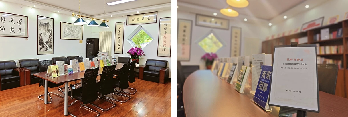 本次银青读书分享,是离退休干部局依托“银青书屋”打造的首场读书交流活动。书屋集“阅读+分享+交流”功能于一体,步入书屋,老同志题写的“银发青衿同穷理,古卷今篇齐品读”对联熠熠生辉,与墙上陈列的老同志书画作品、《银青共建书香机关倡议》全文相映成趣;《寰宇经纬:全球国别与政治经济文化全景100本推荐书目》《视野与格局:360部经典构筑的知识体系》两份推荐书单及精选书籍、荐书语错落有致,彰显出“同读好书、明德修身”的深厚底蕴。自然光透过窗棂漫洒书屋,温暖柔和的光线中,古朴典雅与静谧厚重相互交织,书香墨韵扑面而来,尽显“窗明几净,墨韵涵香”的雅致格调,诚乃“寄闲养心、澄怀明理、立学立身之佳处”。