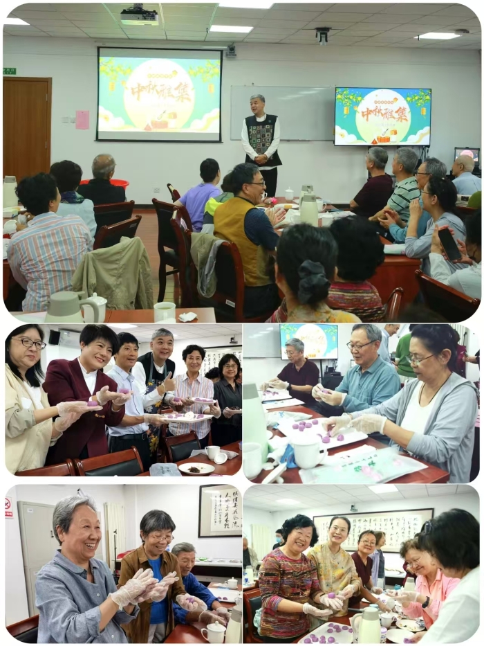 “品茗制饼庆中秋”将气氛推向高潮。老北京旗人民俗美食家、国家级烹饪评委姜波老师结合中秋民俗讲解养生知识,互动问答间笑声不断。老同志们亲手制作冰皮月饼,揉面、包馅、压模,在动手乐趣中分享佳节甜蜜。活动尾声,大家合影留念,定格下欢聚的温馨瞬间。